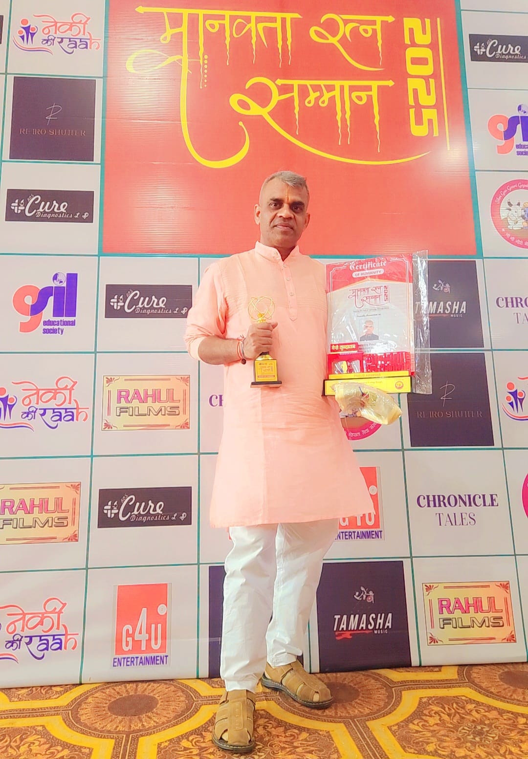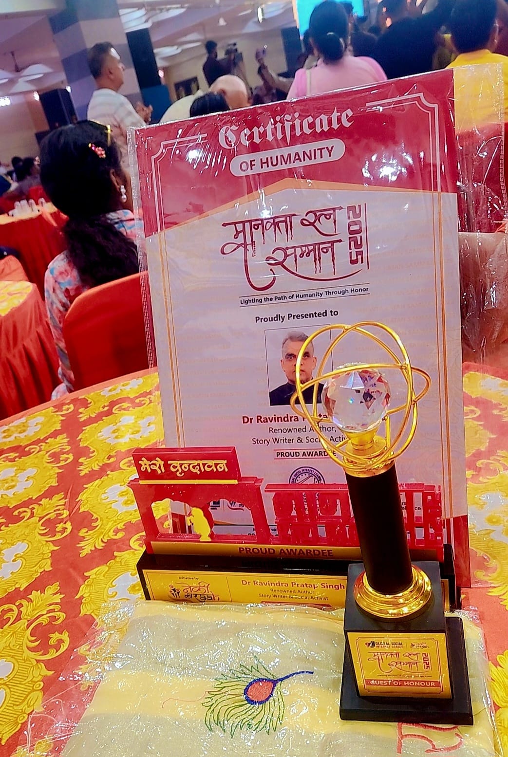 The Manavta Ratna Award is a distinguished honor presented to individuals who embody the spirit of humanity and compassion through their work. Ravindra Ji received this award from Dr. Kiran Bedi, Lieutenant Governor, Puducherry and Spiritual Guru Anurudhracharya in presence of Harsha Richhariya and Pujya Abbiramacharya Ji in recognition of his literary contributions that promote social awareness, empathy, and cultural enrichment. This accolade highlights his commitment to using words as a force for positive change, inspiring readers to embrace values of kindness and human dignity.