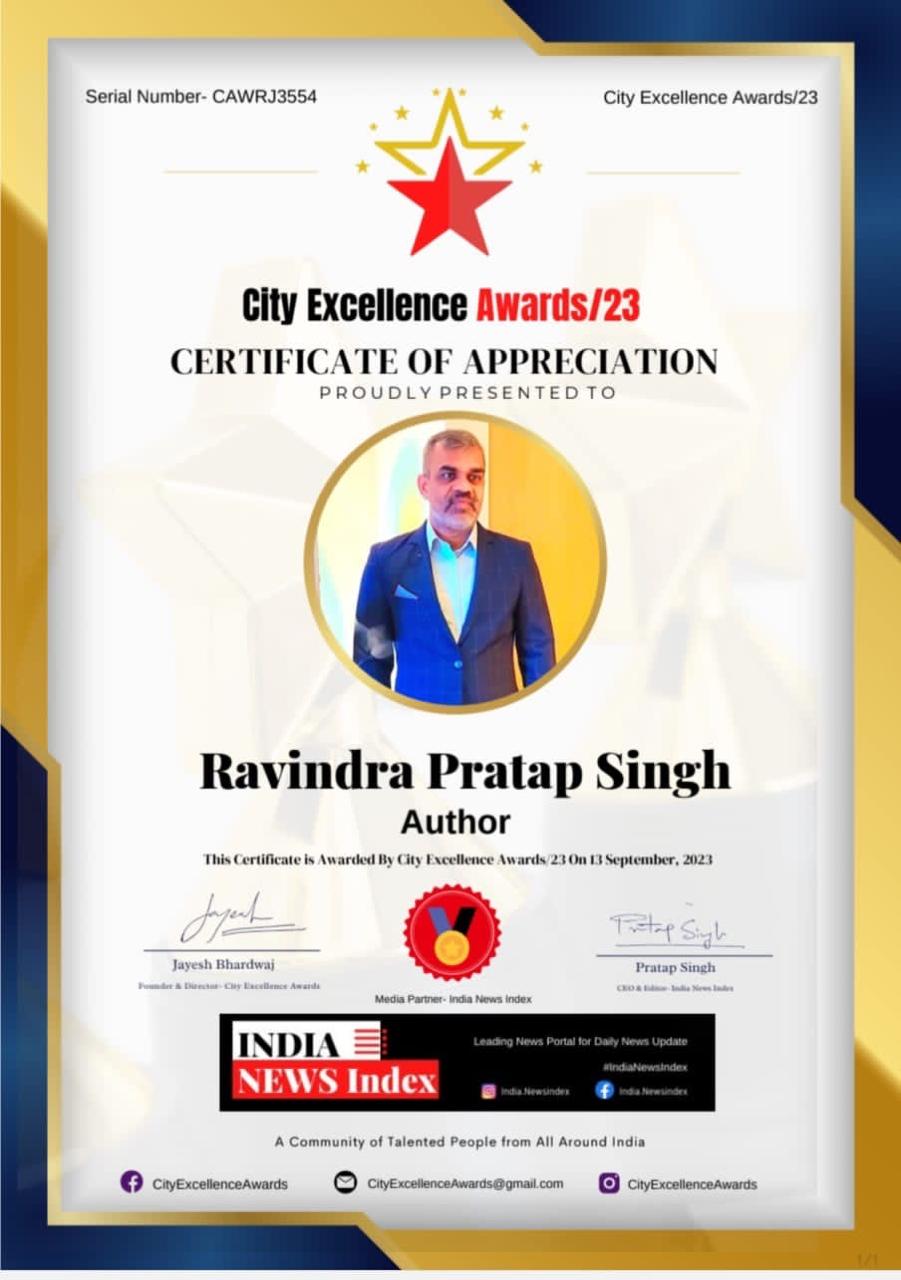 The City Excellence Awards celebrate individuals who contribute meaningfully to the cultural, educational, and social life of their city. Ravindra Ji received this honor in recognition of his literary achievements and his role in enriching the intellectual fabric of the community. The award highlights his dedication to promoting creativity and inspiring citizens through his writings, marking him as a distinguished voice of excellence within the city.